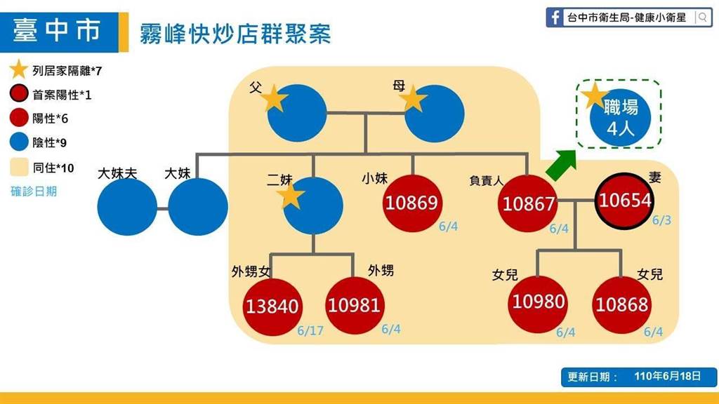 Source: attach.setn.com Jun 05, 2021 · 台中(5)日新增9例本土確診個案足跡(圖/市政府提供2021.6.5) 案10867為44歲男性,無新冠肺炎相關症狀,5月21日至23日店休在家,5月24日餐廳開始營業,6. Jun 18, 2021 · 台中市今(18)日新增2名本土確診案例,1例為霧峰快炒店群聚案10867的外甥女(案13840),另1例為大雅家庭群聚案9555的姊姊(案13782),2例皆為家庭. May 27, 2021 · 全台防疫三級警戒,指揮中心下令再延長至6月14日,26日公布新增302例本土確診、2例境外移入,另有331例校正回歸個案,其中台中市新增9確診案例. Jun 18, 2021 · (中央社記者郝雪卿台中18日電)台中市今天新增2例武漢肺炎本土確診個案,分別是霧峰快炒店及大雅家庭群聚案的接觸者,市府表示,台中市確診. May 29, 2021 · 中央疫情指揮中心今(29日)公布新增例本土個案320例,另有校正回歸個案166例,增21例死亡,其中台中市單日一口氣爆增33例確診案例,據了解以家族.